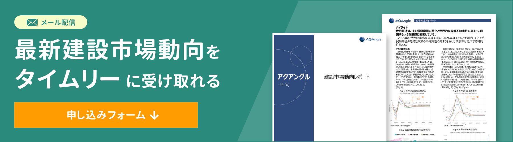 アクアでは、建設コストに関する動向を、専門家の視点で分析・解説したレポート「アクアングル」を無料で発行しています。複雑な情報収集や分析の手間をかけずに、信頼性の高いコスト情報を手に入れたい方は、ぜひお申込みフォームからお申し込みください。