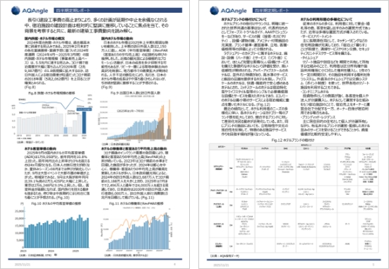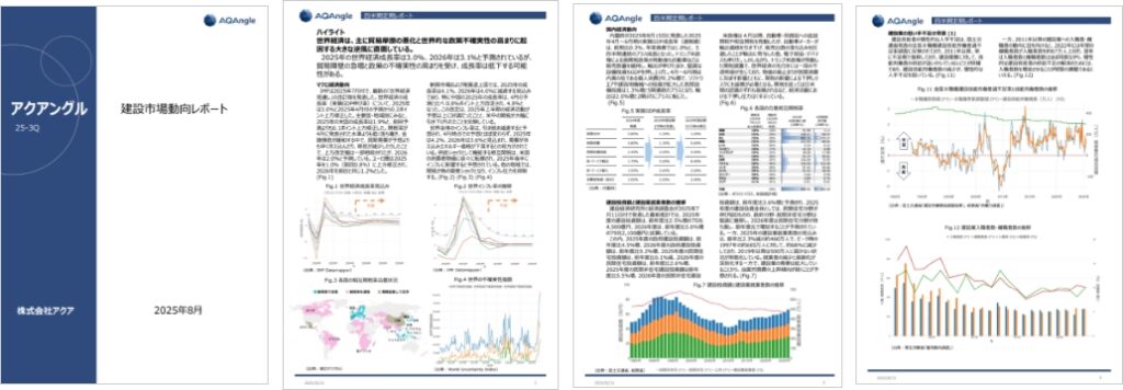 アクアでは、建設市場の動向や建設コストにまつわる情報を受け取ることができるレポート「アクアングル」を、毎月の月次特集、および四半期ごとにはフルレポートも発行しています。