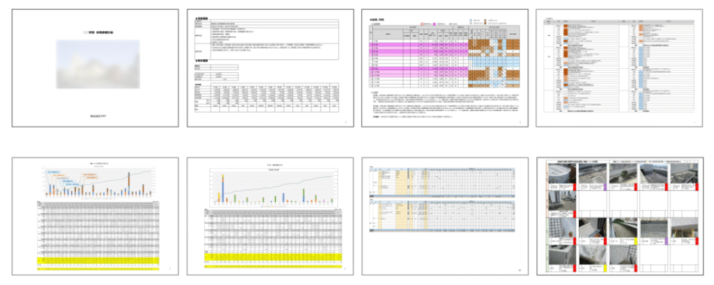 一般的な中長期修繕計画は、中長期修繕計画集計表、中長期修繕計画内訳書、必要に応じて劣化診断報告書で構成されます。