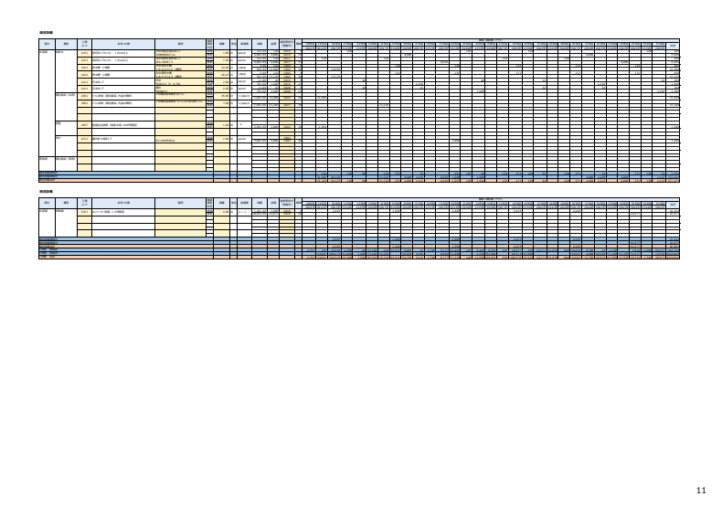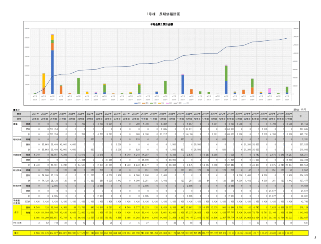 中長期修繕計画集計表では、建築、電気設備、衛生設備、空調設備、防災設備、搬送設備などの大項目ごとに、各年度で必要となる修繕・更新費が記載されます。各年の合計金額は棒グラフ、累計金額は折れ線グラフで表現されることが多く、延床面積(坪)あたりの坪単価を記載すると、複数棟所有時の比較も容易になります。