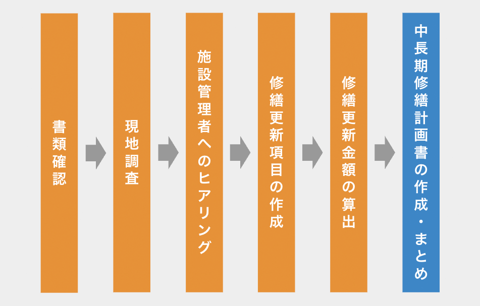 中長期修繕計画の作成手順は、基本的に以下の流れで進められます。まず書類の確認に始まり、現地調査や施設管理者へのヒアリングを経て、修繕・更新項目をリストアップし、修繕更新費を算出します。